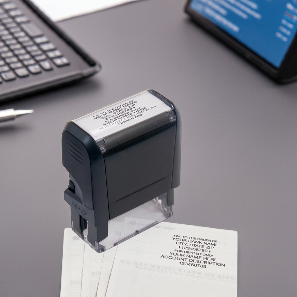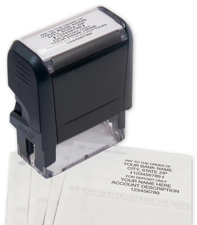 102170 - A Self Inking Endorsement StampSize: 2 3/8 x 7/8" Make deposits faster, easier and more accurately! Imprints your banking information in the format most widely accepted by financial institutions. "PAY TO THE ORDER OF" and "FOR DEPOSIT ONLY"...