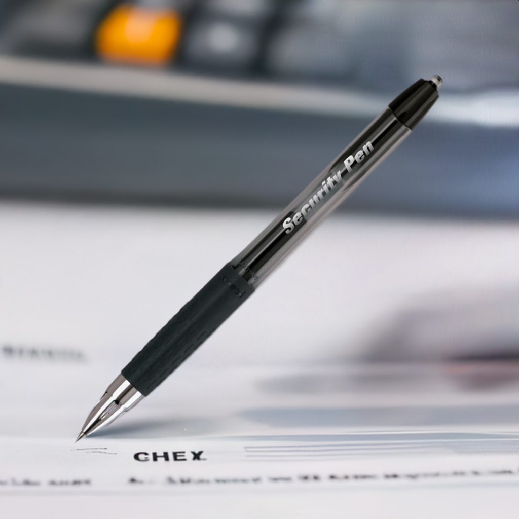 - Security Pen uses special gel ink that binds to the fibers of checks or other important documents