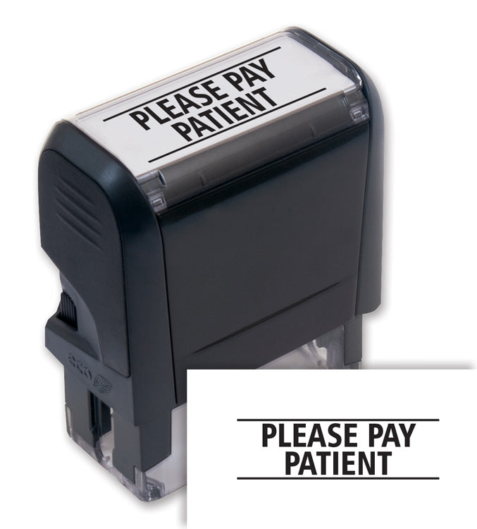 103075 Self-Inking Please Pay Patient StampSize: 1 11/16 x 9/16"Save time and put an end to repetitive writing! Designed for rapid, high-frequency use that will deliver thousands of impressions. No messy ink pads. Super Efficient: Stamp automatically re-inks with each...