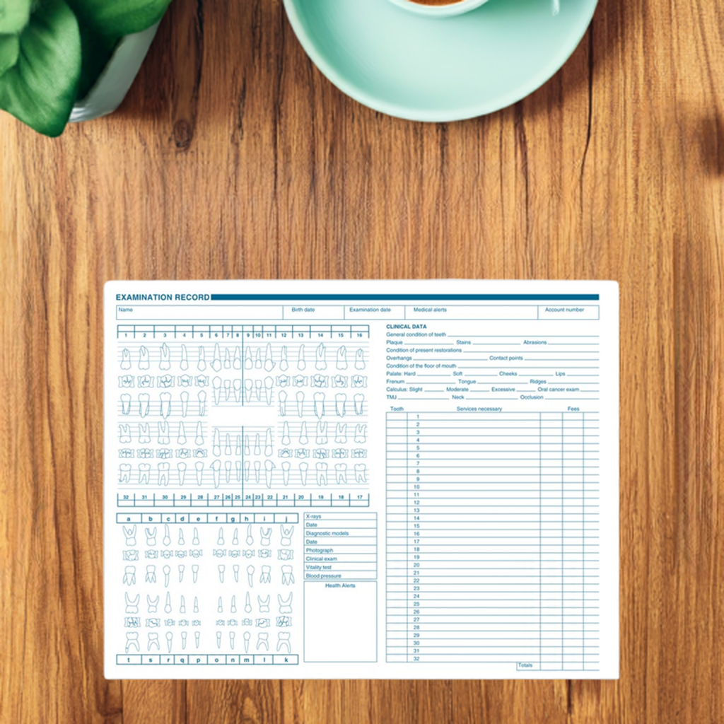 Record every detail of adult and primary dentition in a horizontal format ideal for file envelopes.