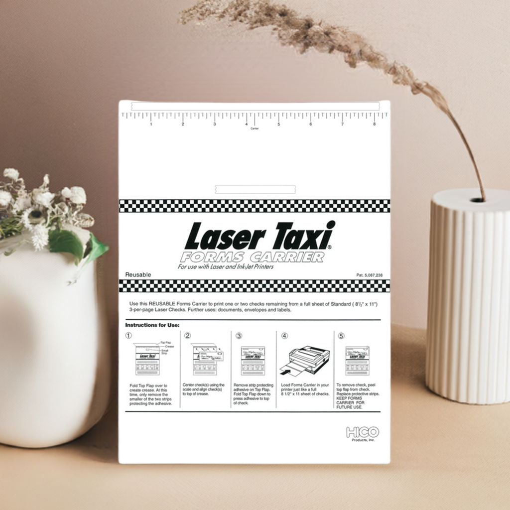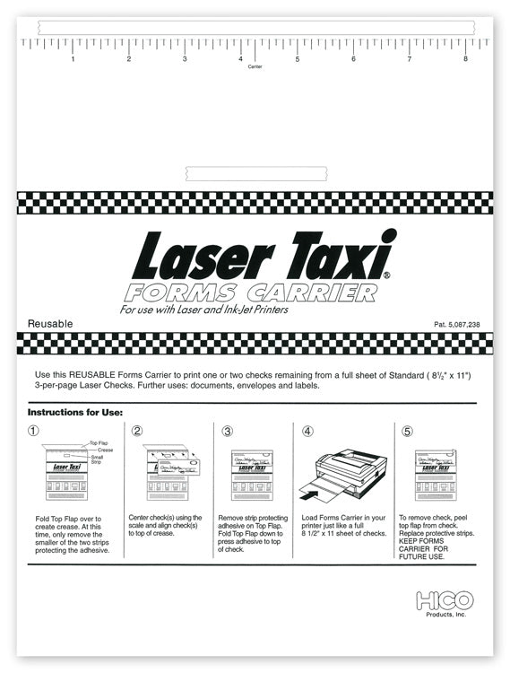 13075 Laser Taxi Size: 8 1/2 x 11" Don't waste partially used 3-On-A-Page laser checks! Reusable adhesive sheet carries remaining 1 or 2 checks safely through your printer. Also use with envelopes, labels and small documents. 20# White Bond This...