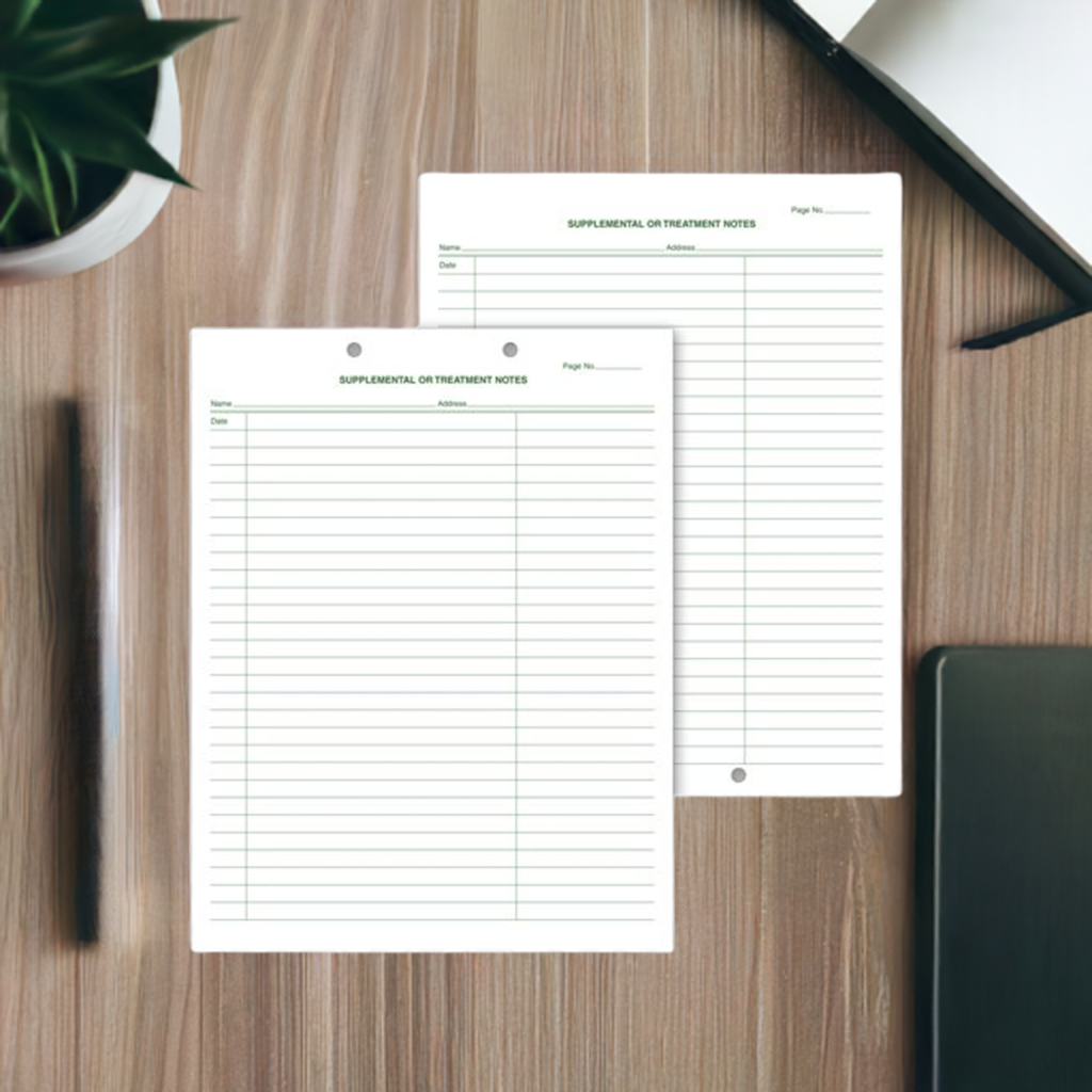 20001V Supplemental & Treatment Notes Two Hole PunchSize: 8 1/2 x 11" Maintain accurate records of case details and treatment.Unique second-side print allows easy reading of form while attached to chart. White ledger with green imprint. Unique 2nd side print allows easy...