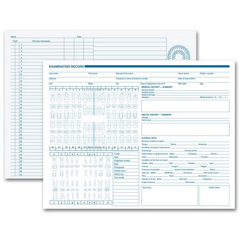 21019 Dental Exam Record Anatomic Diagrams Horizontal FormatSize: 11 x 8 1/2" Accurate charting and notes!Record every detail of adult and primary dentition in a horizontal format ideal for file envelopes. Front features tooth charts with 1-32 numbering and a-t lettering,...
