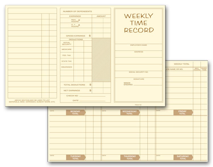Preprinted time cards have ample space to record jobs worked on, hours, overtime, earnings & deductions.