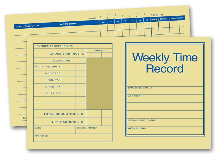 Preprinted time cards have ample space to record jobs worked on, hours, overtime, earnings & deductions.