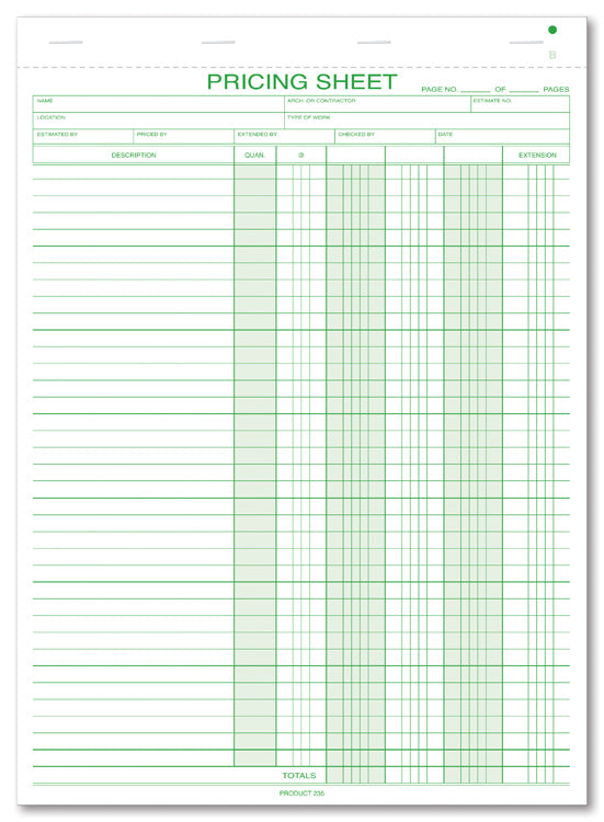 235 Pricing SheetsSize: 8 1/2 x 11" Itemize costs for any job! Preprinted forms have plenty of room for description, quantity, price, and more. Product construction: Pads Padded in sets of 50 per pad with 2 carbons 50lb white Stock...
