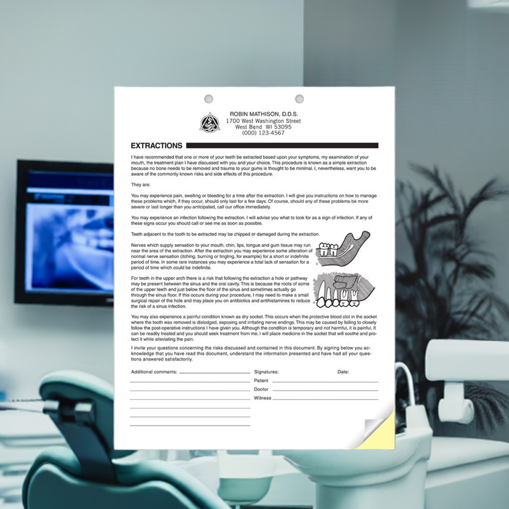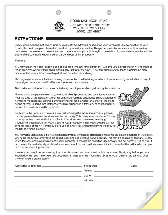 24183 Consent Extractions Form 2 PtSize: 8 1/2 x 11" This 2-part dental form record allows you to document patient consent. Authorized signature line included. 2 Part Stock White, Canary 2 hole punched Add a custom or stock logo to...