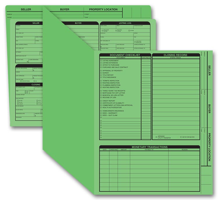 Real Estate listing folders with preprinted headings keep track of showings, advertising and more.
