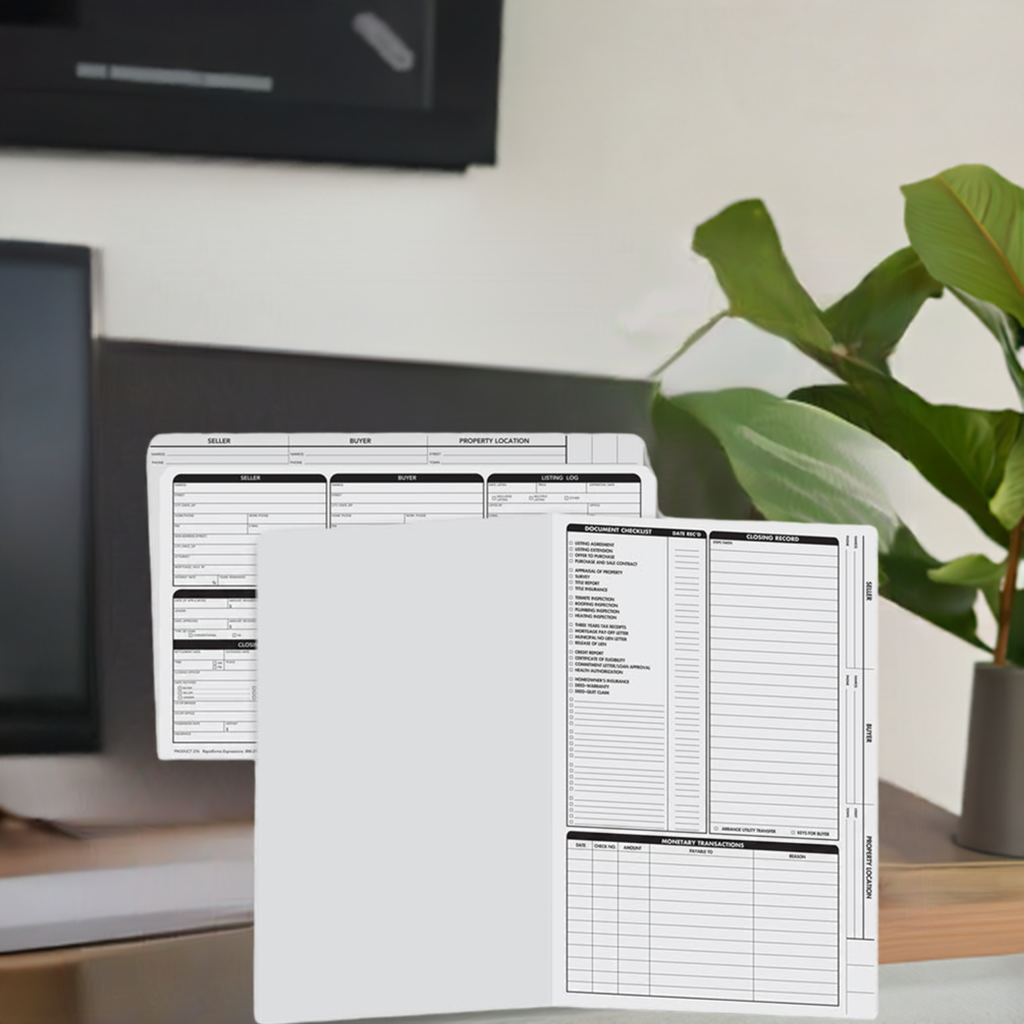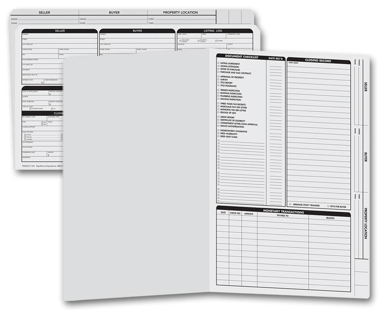 Real Estate listing folders with preprinted headings keep track of showings, advertising and more.