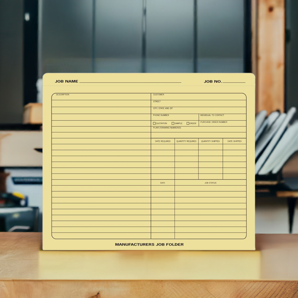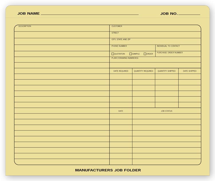 280 Manufacturers Job Folders Size: 10 x 12" Keep detailed information about all your jobs at your fingertips! Preprinted folders help track job progress, costs, and customer correspondence. 50 Folders Keep jobs organized. With Preprinted Info on the outside Records...