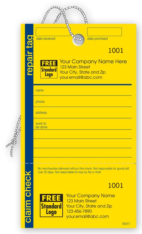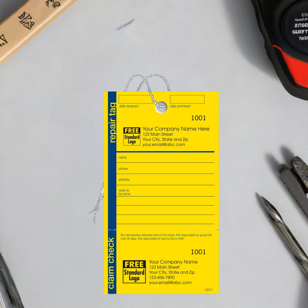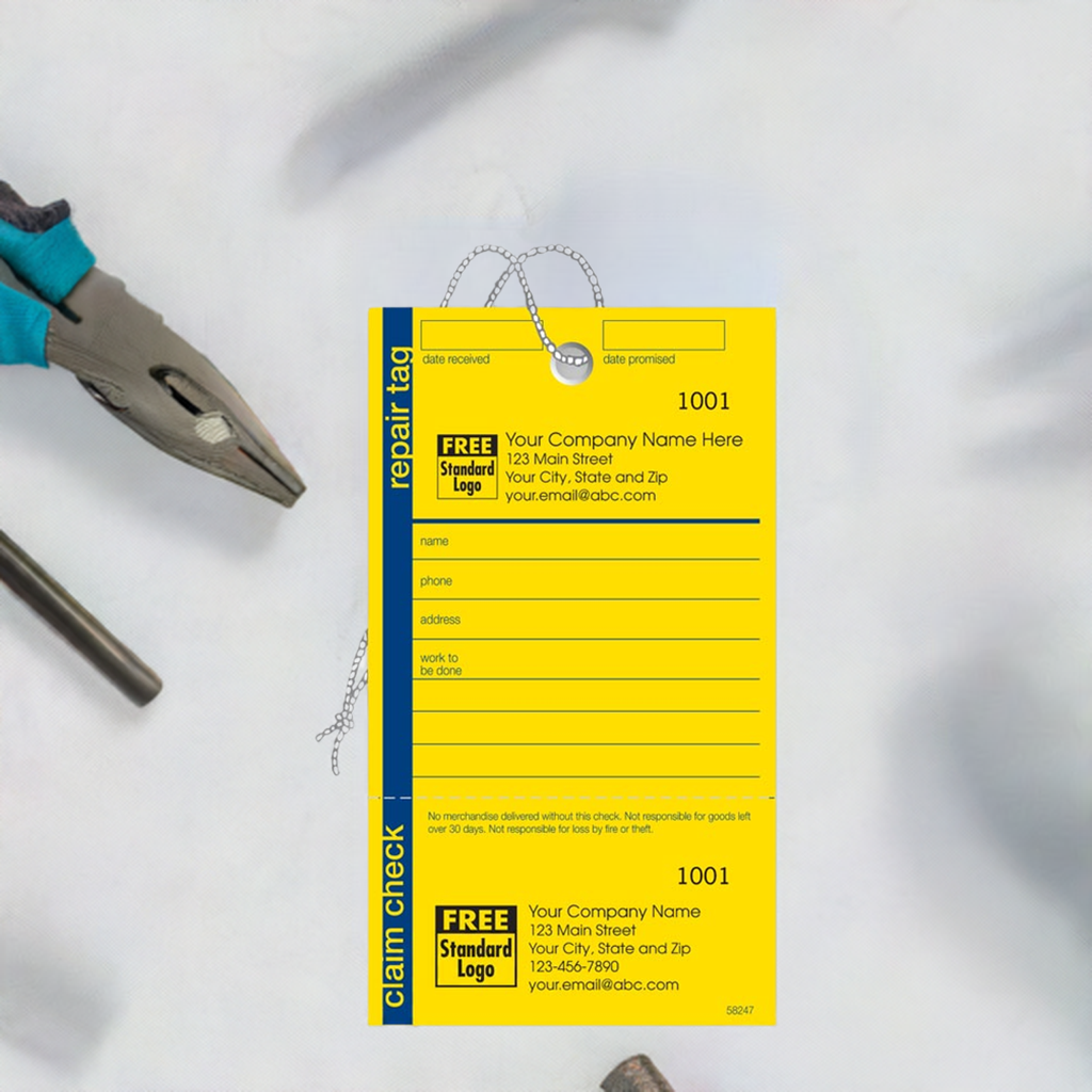 58247 Repair Tag in Yellow w/Navy Border Size: 3 1/8 x 5 1/2"Simplify your paperwork! Capture all the details of your next repair request with these boldly designed tags.A convenient way to keep a clear record of all your repairs!...