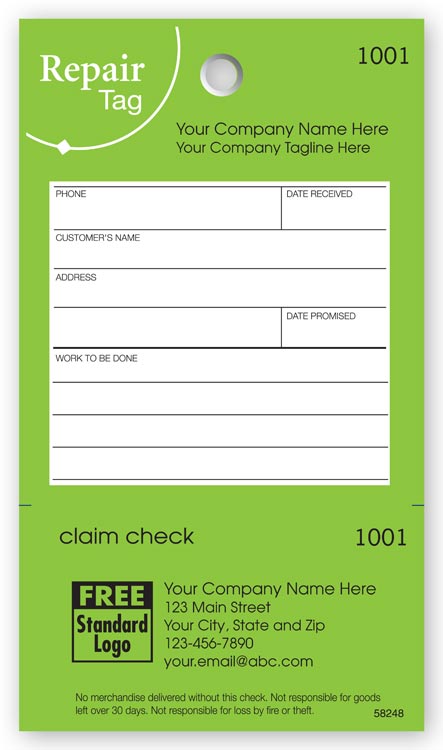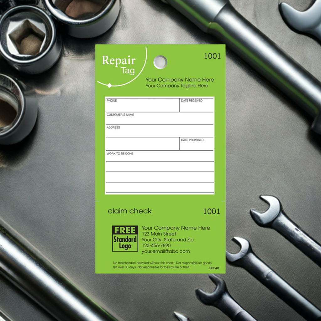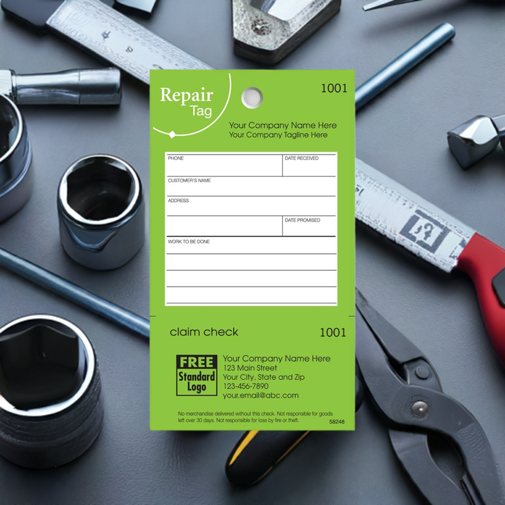 58248 Repair Tag in Green w/White Fill-In Space Size: 3 1/8 x 5 1/2" Simplify your paperwork!Capture all the details of your next repair request with these boldly designed tags.A convenient way to keep a clear record of all your...