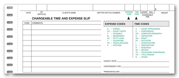 7302 Chargeable Time Expense Slip Size: 7 x 5" Get paid for every minute or dollar you put into a job with these handy slips. Plenty of room for details. Overall Size: 8 x 3 1/2 w/Stub 7 5/16 x...