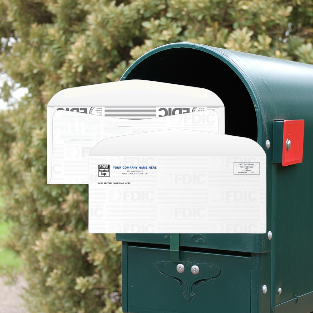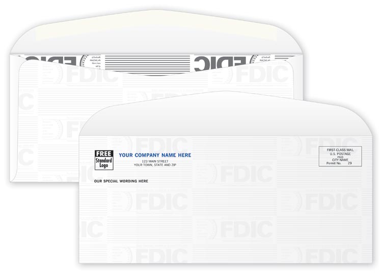 96303 24# White FDIC Tint #9 EnvelopeSize: 8 7/8 x 3 7/8" Look more professional! Envelopes printed with your name and address save you time. Give your business a professional, established look! #9, 24# White Wove Env. Gray FDIC pattern...