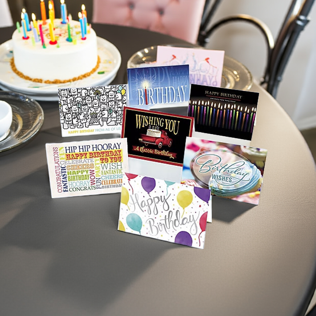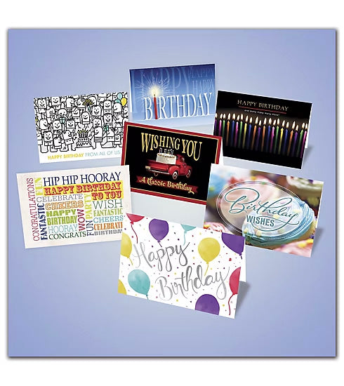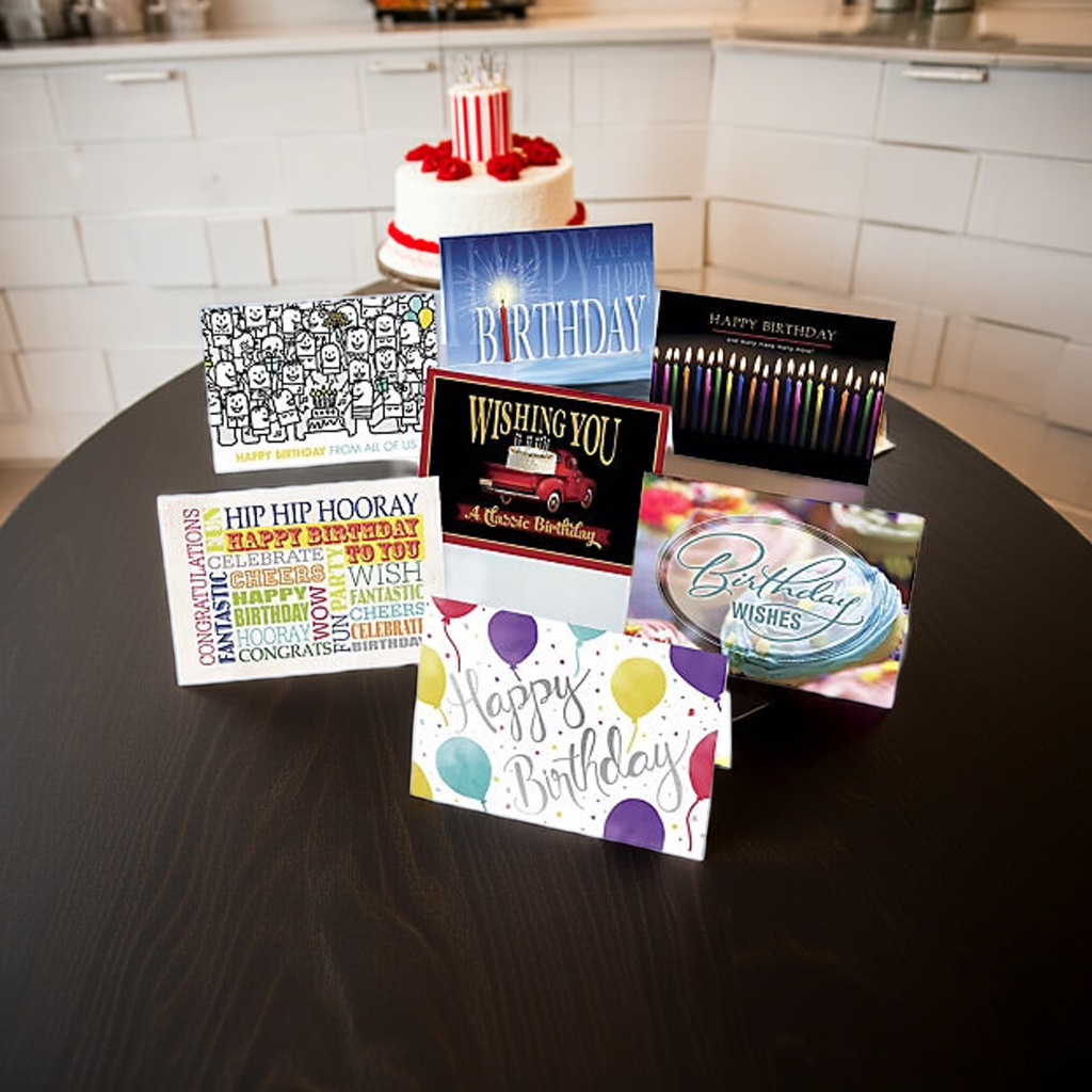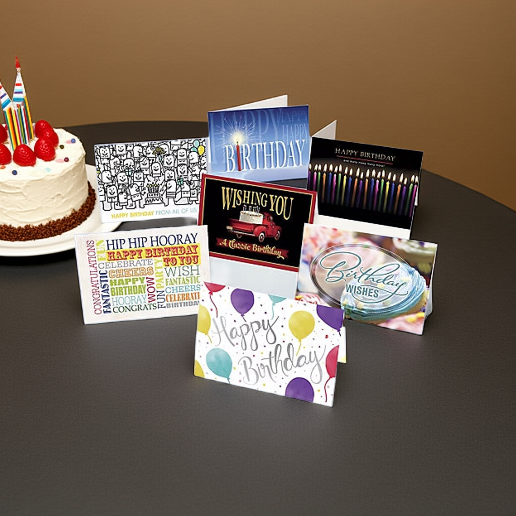 - Assorted birthday-themed greeting cards, including 7 each of Say it All, Happy Bunch, Birthday Bunch, Classic, Sparkler, Joyful Candles and 8 of Sweet Treat.