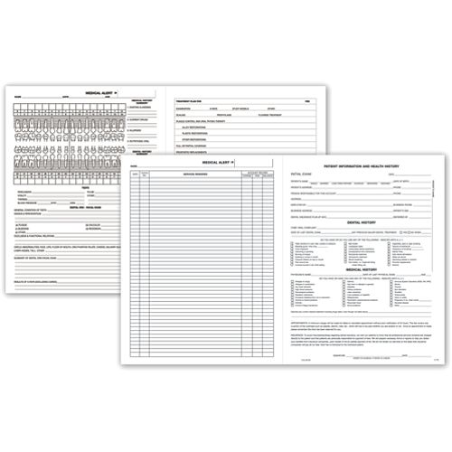 D100 Four-Page Dental Exam Record With Treatment PlanSize: 11 x 17" These comprehensive forms record detailed patient history and treatment plans, with a medical alert box at the top of each page for vital information. Includes tooth charts with "1-32" &...