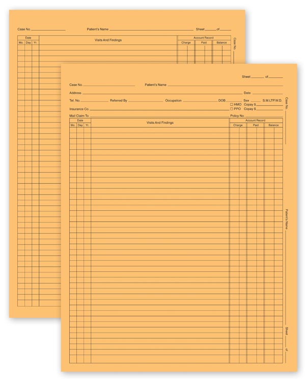 - Medical record formatting on front and back includes columns for dates, visits, findings and account record-keeping.