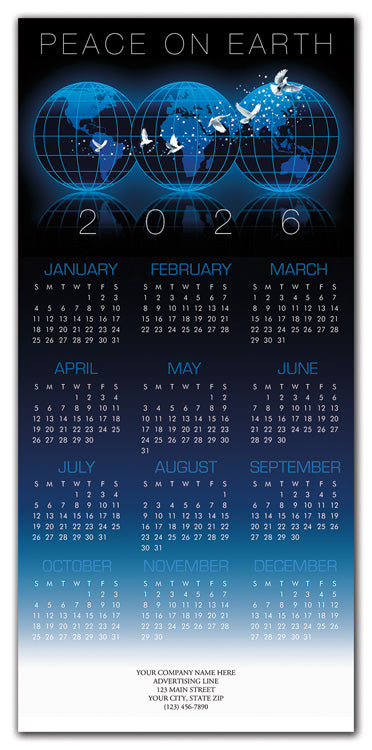 2026 Wishes Calendar CardsSize: 7 7/8 x 5 5/8" (folded) A globe in blue accents your hope for worldwide peace every day of the year on the Peace on Earth Wishes card. This unique all-in-one holiday card and calendar folds up...