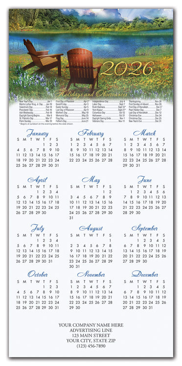 HHZ7410 - N7410 By the Lake Calendar CardSize: 7 7/8 x 5 5/8Two Adirondack chairs sit at the end of a lake dock at sunset on the By the Lake Card. Featuring a full calendar, your company name and personal message...