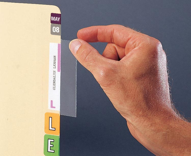 Transparent self-adhesive mylar tabs fit over top of file labels to prevent smears, tears and peeling.