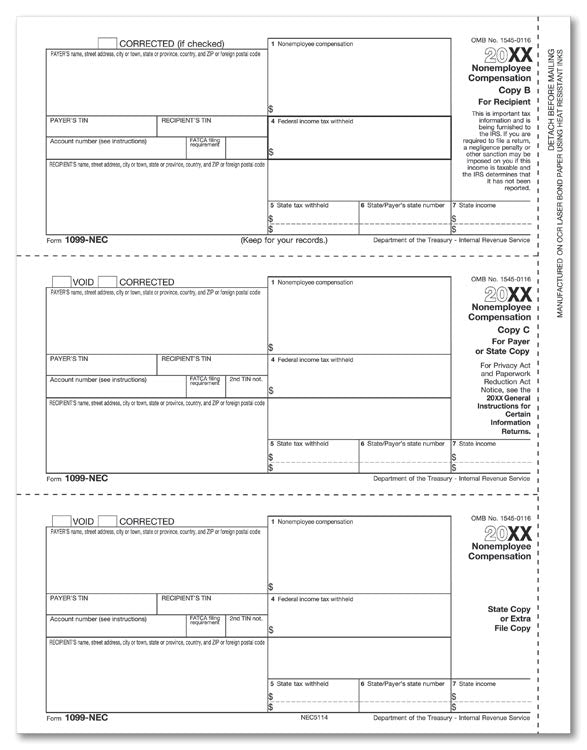 NE5114 1099-NEC Recipient Copy B Payee & ST, Copy C & STSize: 8 1/2 x 11" This popular format for reporting miscellaneous payments and non-employee compensation meets all government and IRS filing requirements. Use to Report: Miscellaneous payments such...