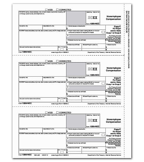 NEC5112 1099-NEC Payer State Copy C Cut Sheet Size: 8 1/2 x 11" This popular format for reporting miscellaneous payments and non-employee compensation meets all government and IRS filing requirements. Use to Report: Miscellaneous payments such as rents, royalties, medical...