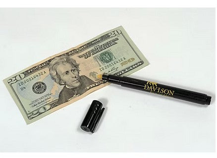 Detector pen identifies counterfeit money with a touch - gold/yellow means it is real, while a dark brown/black dot means it is suspect.