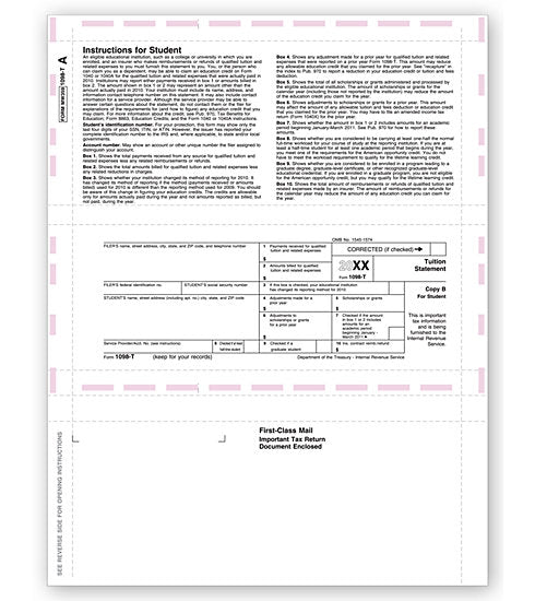 The 1098T Copy B is used for reporting tuition payments and this form also has small glue capsules around the edge of forms that burst when run through a sealing machine create a bond, thus creating a self-mailer.