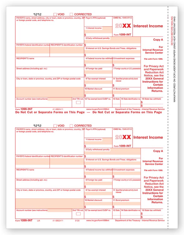 TF5120B Laser 1099-INT Income Federal Copy A Bulk Size: 8 1/2 x 11" Meets all government and IRS filing requirements.Popular format is ideal for reporting interest paid. Convenient! Experience less tearing with these micro-perforated forms. Government approved 20# bond paper...