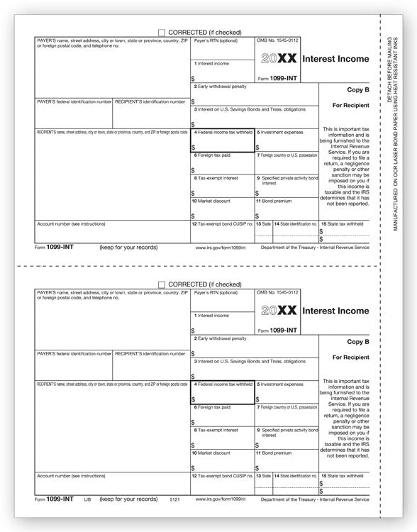 TF5121 Laser 1099-INT Interest Income Recipient Copy B Size: 8 1/2 x 11" This 1099-INT meets all government and IRS filing requirements for Interest Income on Recipient Copy BMeets all government and IRS filing requirements.Popular format is ideal for reporting...
