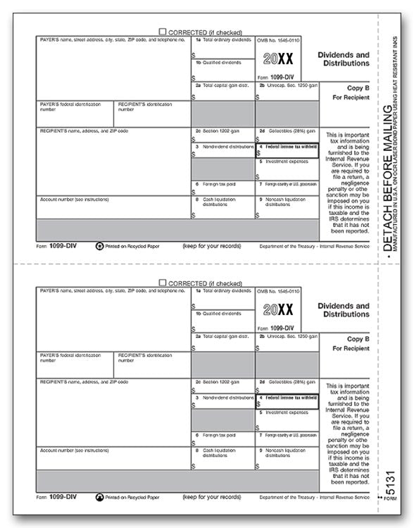 TF5131 Laser 1099-DIV Dividends and Distributions Income Recipient Copy B Size: 8 1/2 x 11" A full line supplier of tax forms but you only need order the forms you require for filing.Meets all government and IRS filing requirements.Popular format...