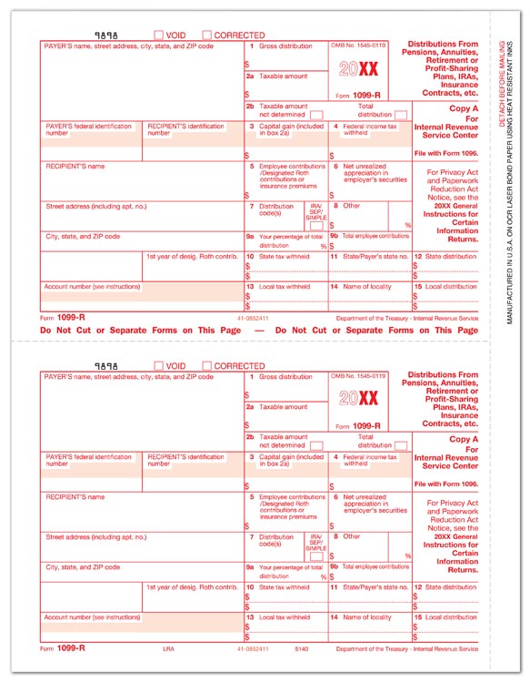 TF5140B Laser 1099-R Copy A Bulk Size: 8 1/2 x 11"We are a full line supplier of tax forms offering standard and bulk quantities.Meets all government and IRS filing requirements.Popular format is ideal for reporting distributions from retirement or profit-sharing...