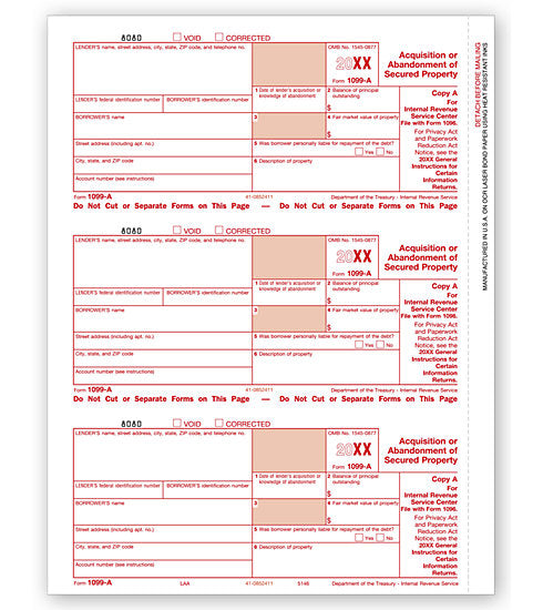 TF5146 Laser 1099-A Federal Copy A Size: 8 1/2 x 11"Meets all government and IRS filing requirements.Popular format is ideal for reporting acquisition or abandonment of secured property. Type of Forms: Federal Copy A. What to report: Information about the...