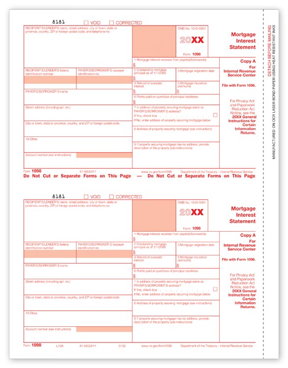 TF5150B Laser 1098 Mortgage Interest Federal Copy A Bulk Size: 8 1/2 x 11" Use to report mortgage interest (including points) and certain mortgage insurance premiums you received in the course of your trade or business from individuals and reimbursements...