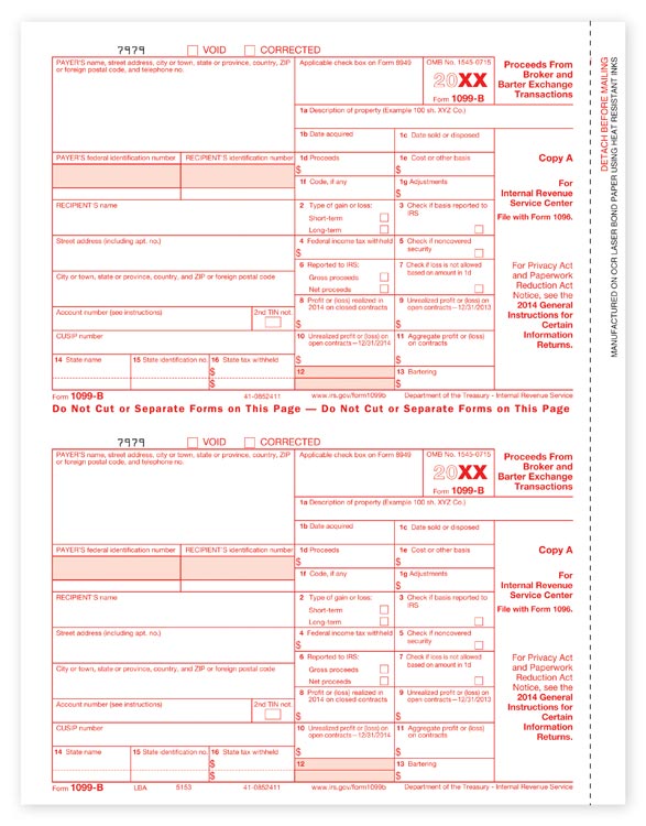 TF5153 Laser 1099-B Federal Copy A Size: 8 1/2 x 11" We can supply all of your tax form needs including 1099's, W-2's and matching envelopes.Meets all government and IRS filing requirements.Popular format is ideal for reporting proceeds from broker...