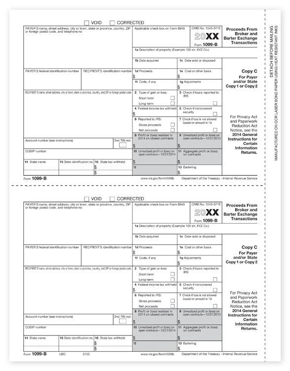 TF5155 Laser 1099-B State Copy C Size: 8 1/2 x 11"This popular format of the 1099-B State Copy C is perfect for reporting proceeds from broker and barter exchange transactions. Meets all government and IRS filing requirements.Popular format is ideal...