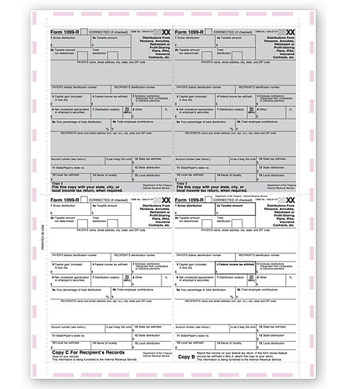 TF5177 Laser 1099-R 4-Up Pressure Seal Size: 8 1/2 x 11"We offer a variety of 1099-R tax forms. Popular format is ideal for reporting distributions from retirement or profit-sharing plans. Meets all government and IRS filing requirements.Make your own self-mailer....