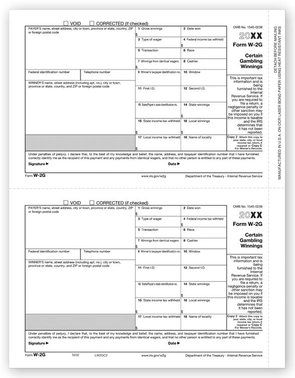 TF5232 Laser W-2G Winner Copy 1/C Size: 8 1/2 x 11" Use this laser W-2G tax form to report gambling winnings.Meets all government and IRS filing requirements.Popular format is ideal for reporting certain gambling winnings. Use to Report: Gambling winnings...