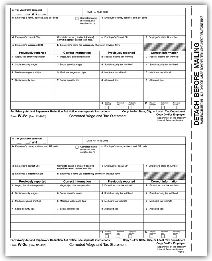 TF5315 Laser W-2C Corrected Wage State City or Local Copy 1 or D Size: 8 1/2 x 11"We are a full line supplier of tax forms but you only need order the forms you require for filing.Meets all government and...