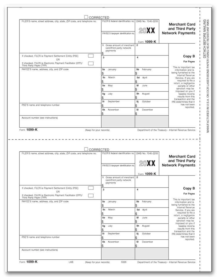 TF5326 Laser 1099-K Copy B Size: 8 1/2 x 11" Popular format is ideal for reporting merchant card and third party network payments.Meets all government and IRS filing requirements. Use to Report: Income that you received from credit cards, debit...