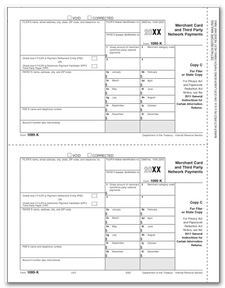 TF5327 Laser 1099-K Copy C Size: 8 1/2 x 11"Popular format is ideal for reporting merchant card and third party network payments.Meets all government and IRS filing requirements. Use to Report: Income that you received from credit cards, debit cards,...