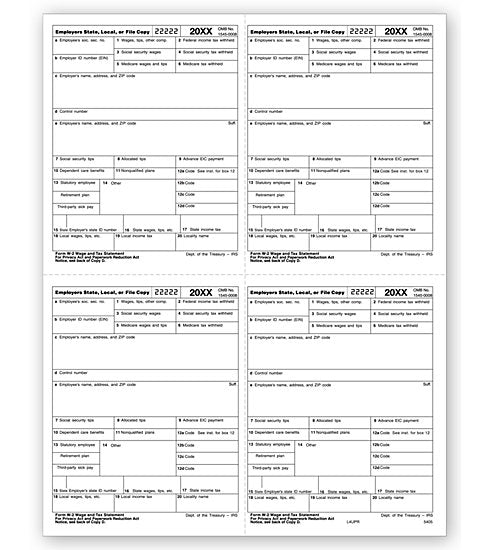 TF5405B Laser W-2 Employer Copy 4-Up Bulk Size: 8 1/2 x 11"Popular format is ideal for reporting wages paid.Ideal for any business!Meets all government and IRS filing requirements. Order according to the number of employees needed. Handy format! Handy format!...
